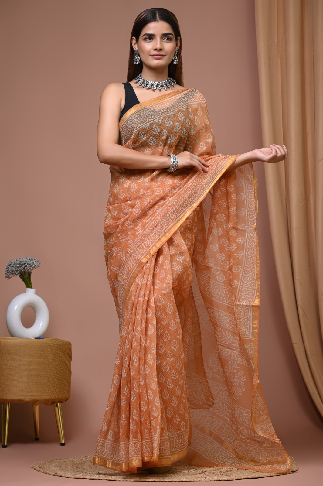 Indulge in the timeless art of hand block printing with our exquisite Bagru handblock printed Kota doria saree. Crafted from lightweight and breathable kota doria fabric, this saree features intricate white floral and geometric motifs that exude traditional elegance. The golden border adds a touch of sophistication, making it perfect for special occasions. The pallu showcases detailed patterns, enhancing its artisanal charm.