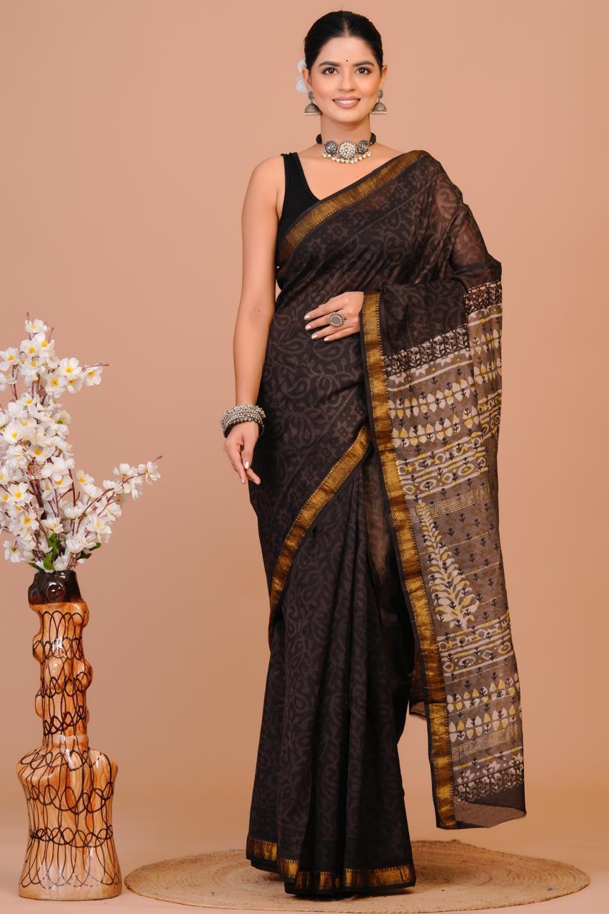 Hand block printing, a centuries-old art form, infuses each piece with cultural significance and unique character. Carefully crafted by skilled artisans, this saree embodies the rich heritage of Indian textile traditions.