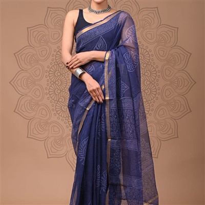Indulge in the timeless elegance of hand block printing with our exquisite Golden Border Navy Blue Kota Doria Saree. Crafted from premium Kota Doria fabric, this saree features intricate traditional patterns in a lighter shade of blue, enhancing its allure. The golden border adds a touch of sophistication, elevating your ethnic look effortlessly. The lightweight, sheer fabric drapes gracefully, offering both comfort and style.
