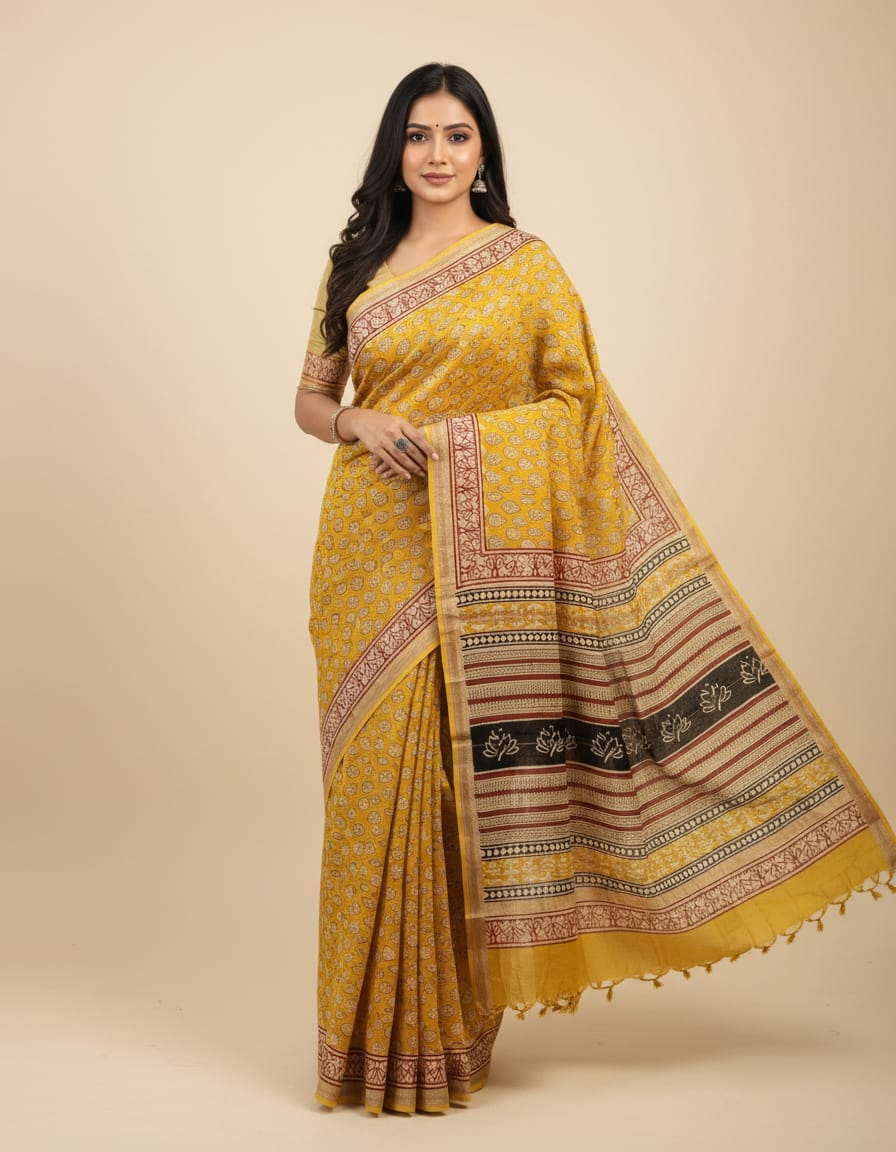 Step into a narrative woven from the threads of tradition and artistic flair with our Golden & Crimson Floral Maheshwari Silk Saree. This exquisite piece showcases the artistry of Bagru hand block printing, where skilled artisans infuse life into fabric, creating a tapestry that speaks of heritage and beauty.