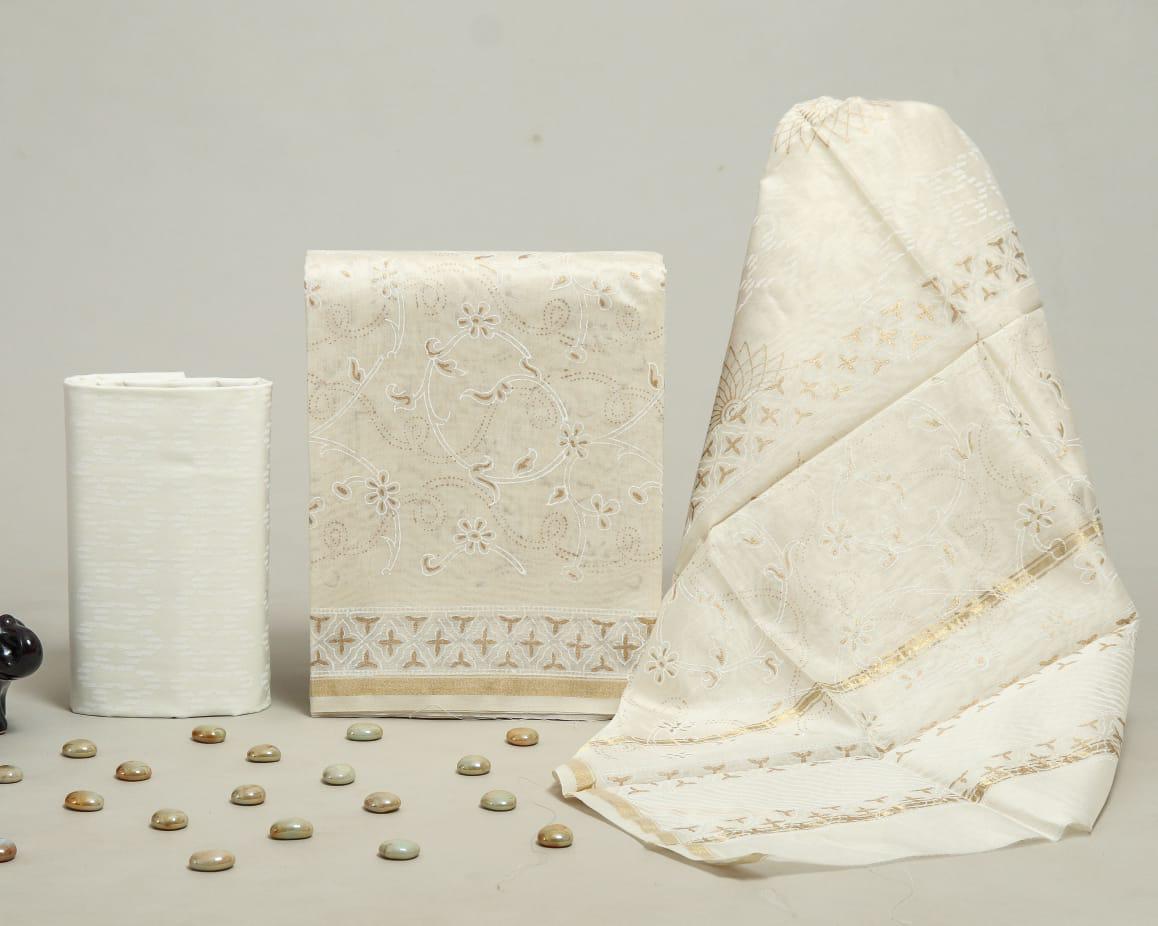 Experience the elegance of traditional Indian craftsmanship with this exquisite hand block printed Chanderi silk dress set from Blockart. The set includes a top and dupatta in luxurious Chanderi silk, complemented by a cotton bottom, offering a perfect blend of comfort and style. The intricate floral embroidery with gold and white thread adds a touch of sophistication. Ideal for formal occasions or ceremonial wear.