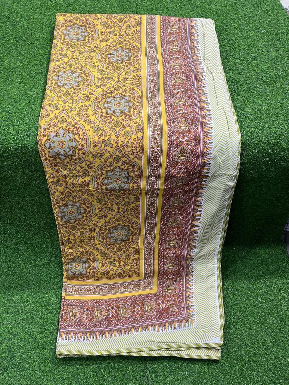 Steeped in the rich traditions of Indian textile artistry, our Golden Floral Geometric Cotton Dohar showcases a stunning interplay of deep crimson and rust floral motifs against a radiant golden yellow backdrop. This reversible piece is not just a textile; it’s a celebration of craftsmanship, where each floral pattern is meticulously created, reflecting the dedication of artisans who breathe life into every design.