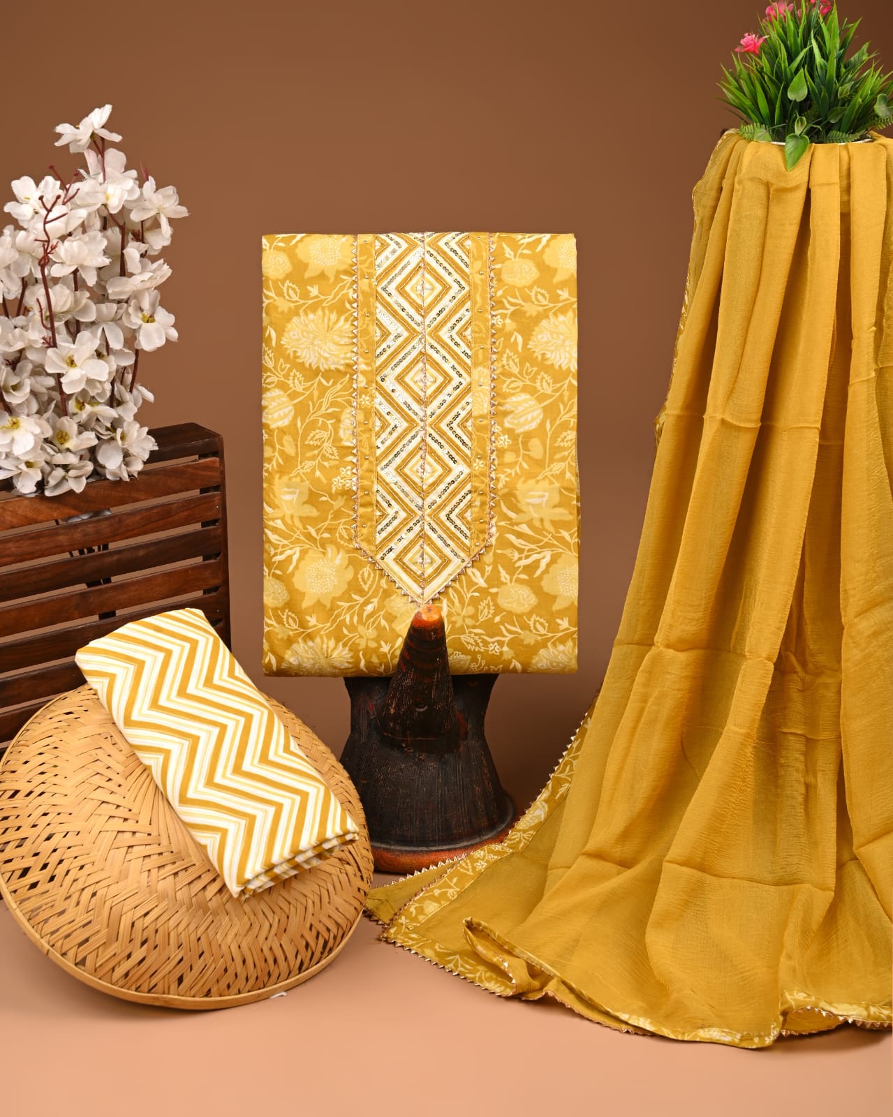 Are you seeking a vibrant addition to your wardrobe? This lovely ensemble features a warm mustard yellow base adorned with intricate floral designs and a chic zigzag pattern that captures the essence of artisanal craftsmanship. The fabric is soft and breathable, giving you comfort throughout your day.