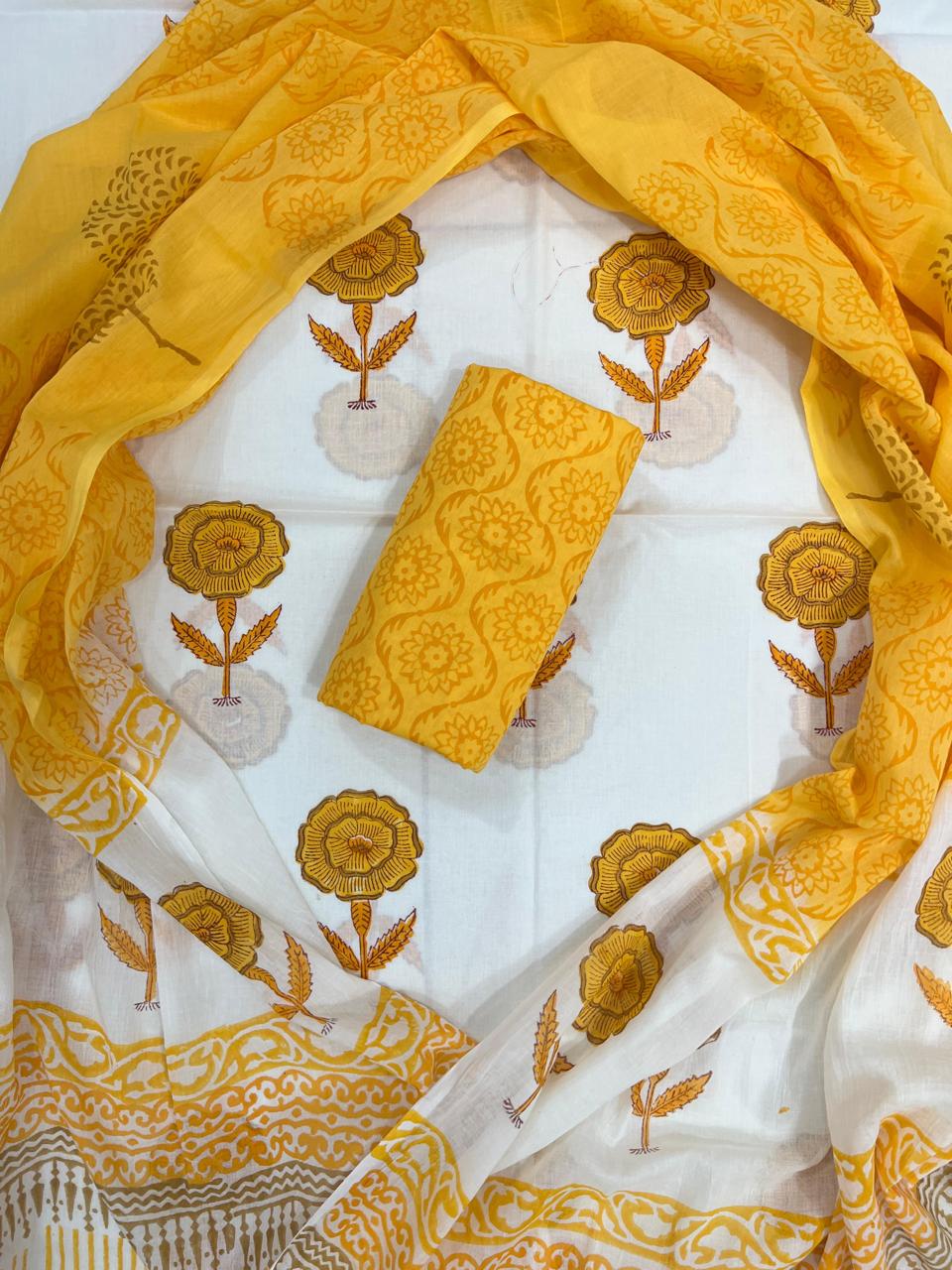 Wrap yourself in a kaleidoscope of sunshine with our Golden Harmony Floral Cotton Dress Material. The vibrant golden yellow base, adorned with intricate floral motifs in burnt orange, invites warmth and cheer. Each pattern is lovingly created through traditional block printing, a technique that embodies the heart of Indian textile heritage.