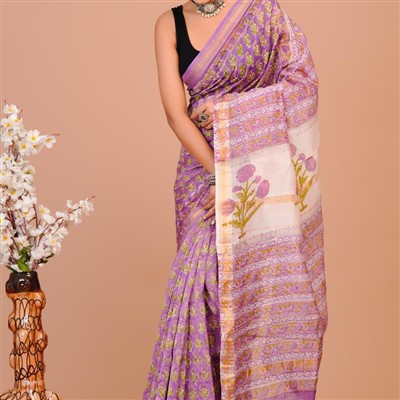 Hand block printed with precision, each motif tells a story of artisanal skill passed down through generations. The contrasting colors play harmoniously, enhancing the saree's allure and making it a versatile piece for various occasions.