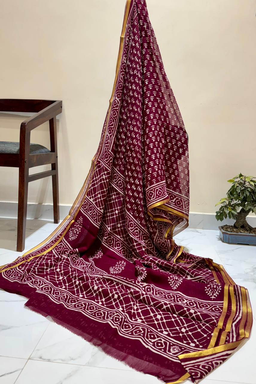 Golden Maroon Blossom Handblock Saree in Pure Double Diamond Chiffon