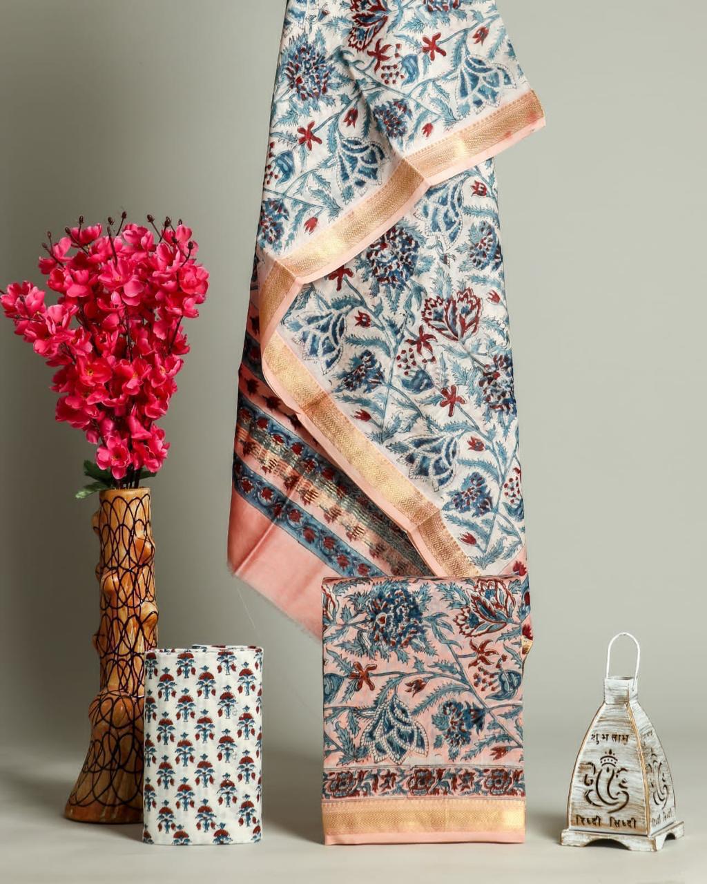 Handblock printed Maheswari silk suits set includes:
