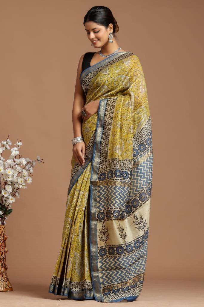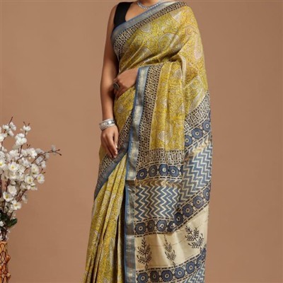 Experience the artistry and grace of Indian textiles with our Golden Mustard Hand Block Printed Maheshwari Silk Saree, a timeless piece that embodies the essence of ethnic elegance.