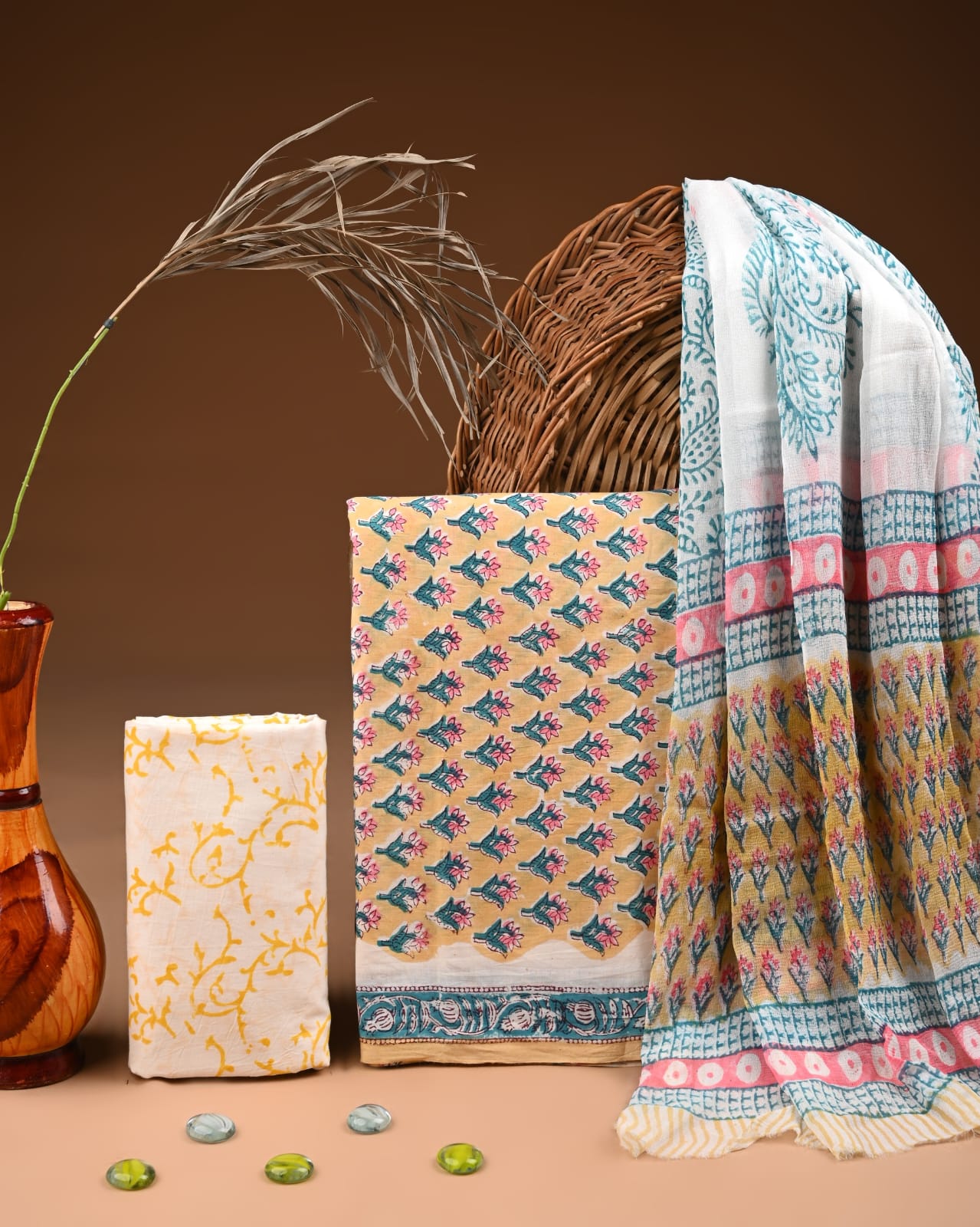 Searching for that special ensemble that effortlessly melds comfort with artistry? Look no further than our Golden Ochre Garden Motif Cotton Suit Set, designed to cater to your desire for both elegance and ease. The soothing golden ochre base is adorned with intricate floral impressions, each telling a story of masterful craftsmanship.