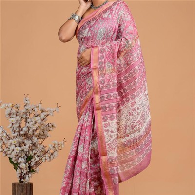 Indulge in the luxurious elegance of this Golden Paisley Silk Saree with Floral Pallu from Blockart. Crafted with exquisite Maheshwari silk, this saree drapes like a dream, offering a soft touch against your skin. The intricate floral and paisley patterns in shimmering white and gold add a touch of traditional charm, while the broad golden border with pink highlights exudes sophistication. Each detail is a testament to the skilled artisans who meticulously hand block print every inch, creating a piece of wearable art.