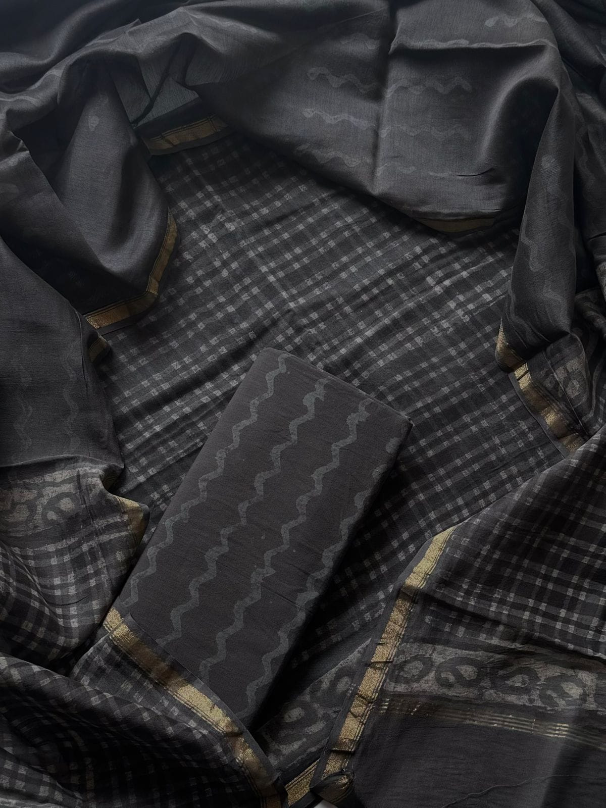 Immerse yourself in the allure of the Golden Spice Checkered Chanderi Silk Ensemble. The intricate checkered pattern, adorned with artisan wave motifs, creates a mesmerizing visual appeal. The blend of black, grey, and golden hues harmonize beautifully, exuding sophistication and elegance.