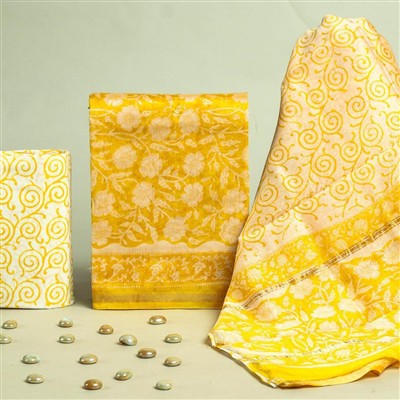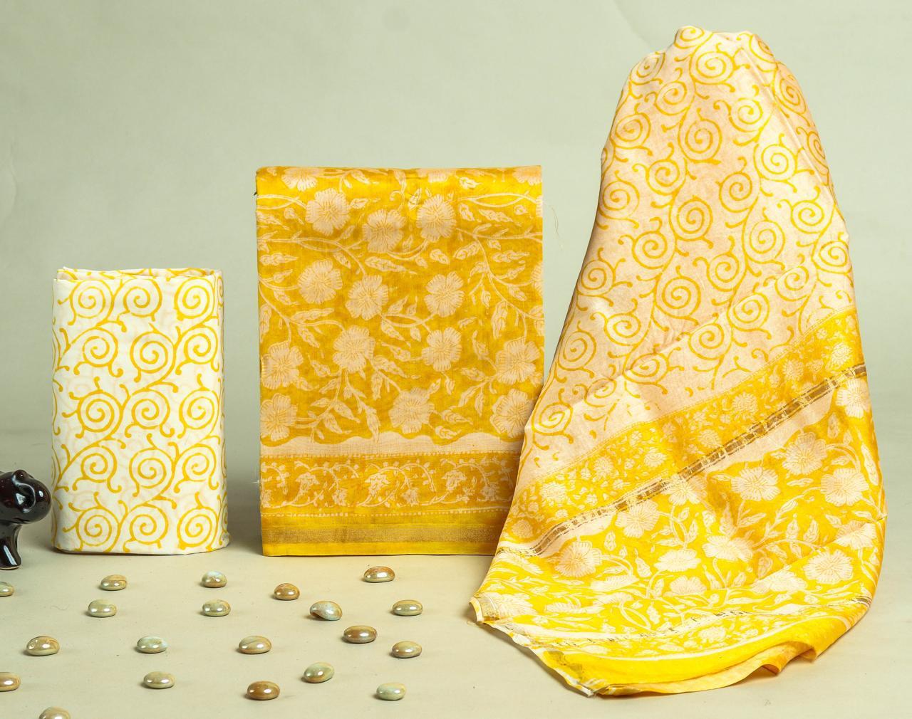 Elevate your wardrobe with this exquisite Golden Swirl Chanderi Silk Dress Set with Floral Dupatta from Blockart. Crafted from premium chanderi silk, the set features intricate hand block printing in yellow shades on white and yellow backgrounds. The top and dupatta showcase delicate floral patterns, while the bottom offers comfort in soft cotton fabric. Embrace the artistry and comfort of traditional Indian wear with this ensemble. Explore more Chanderi Sarees