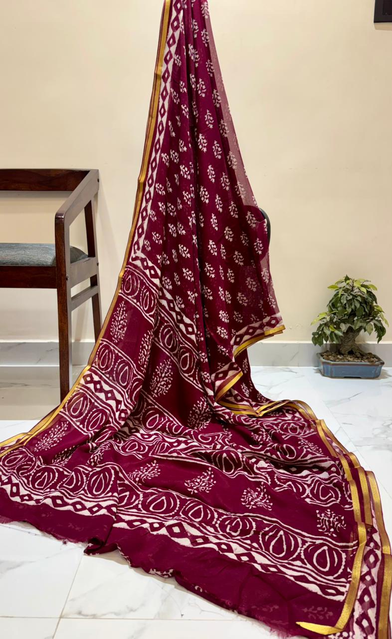 Golden-Yellow Trimmed Maroon Hand Block Print Chiffon Saree