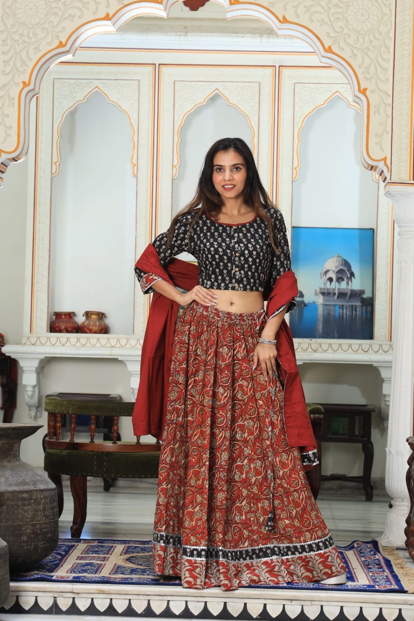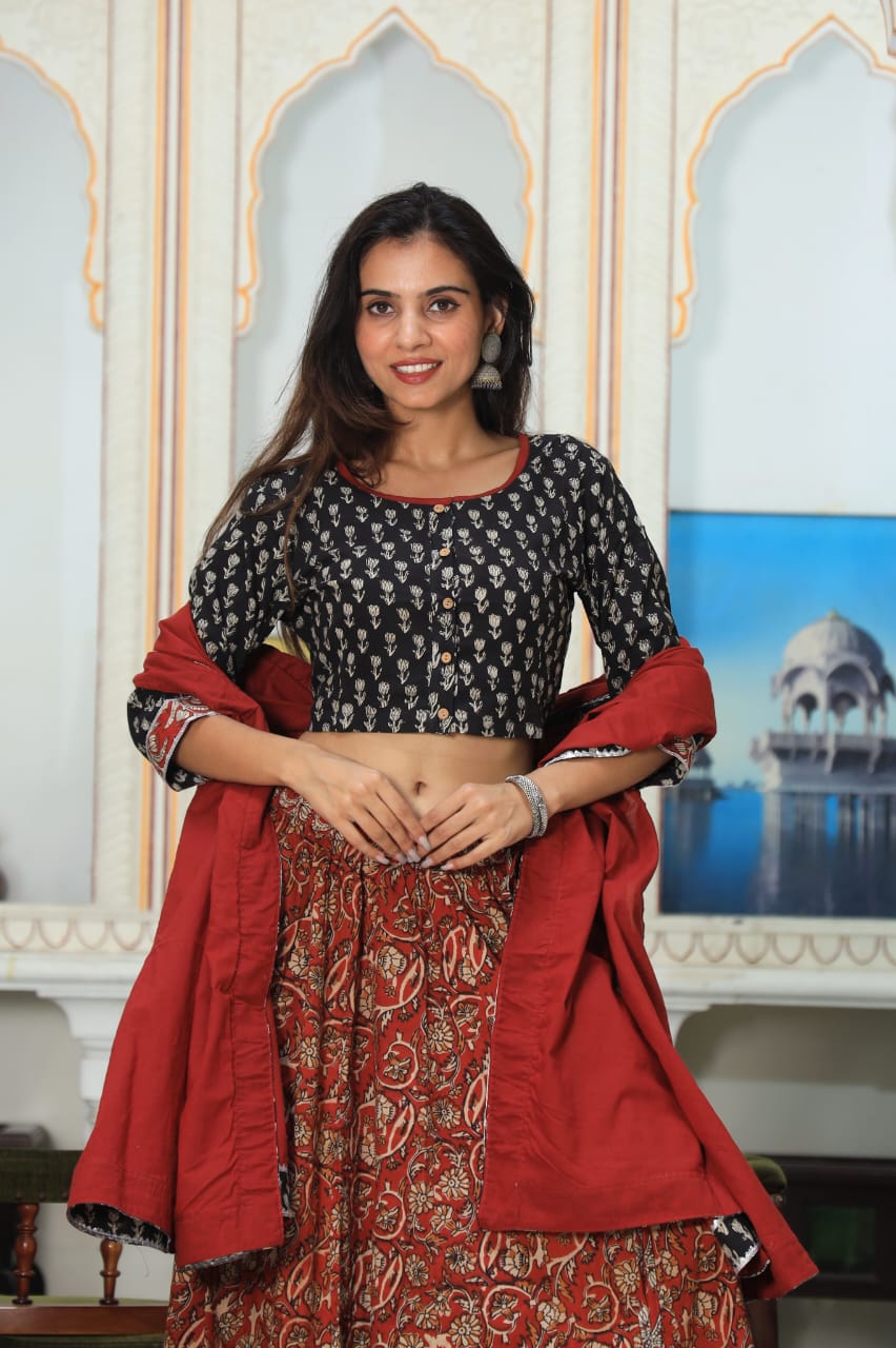 Steps in timeless elegance with this beautifully prepared traditional suit, adorned with complex hand block prints. Black kurtas with delicate motifs perfectly pairs with rich red flared skirts, showing classic floral patterns inspired by heritage artistry. A plain dark red scarf, which is bounded with exquisite hand blocks, completing the artist contingent, adding a touch of sophistication and grace. Perfect for festive opportunities, cultural ceremonies, or elegant evenings, this dress mixes comfort with traditional attraction, which is necessary for lovers of authentic ethnic wear.