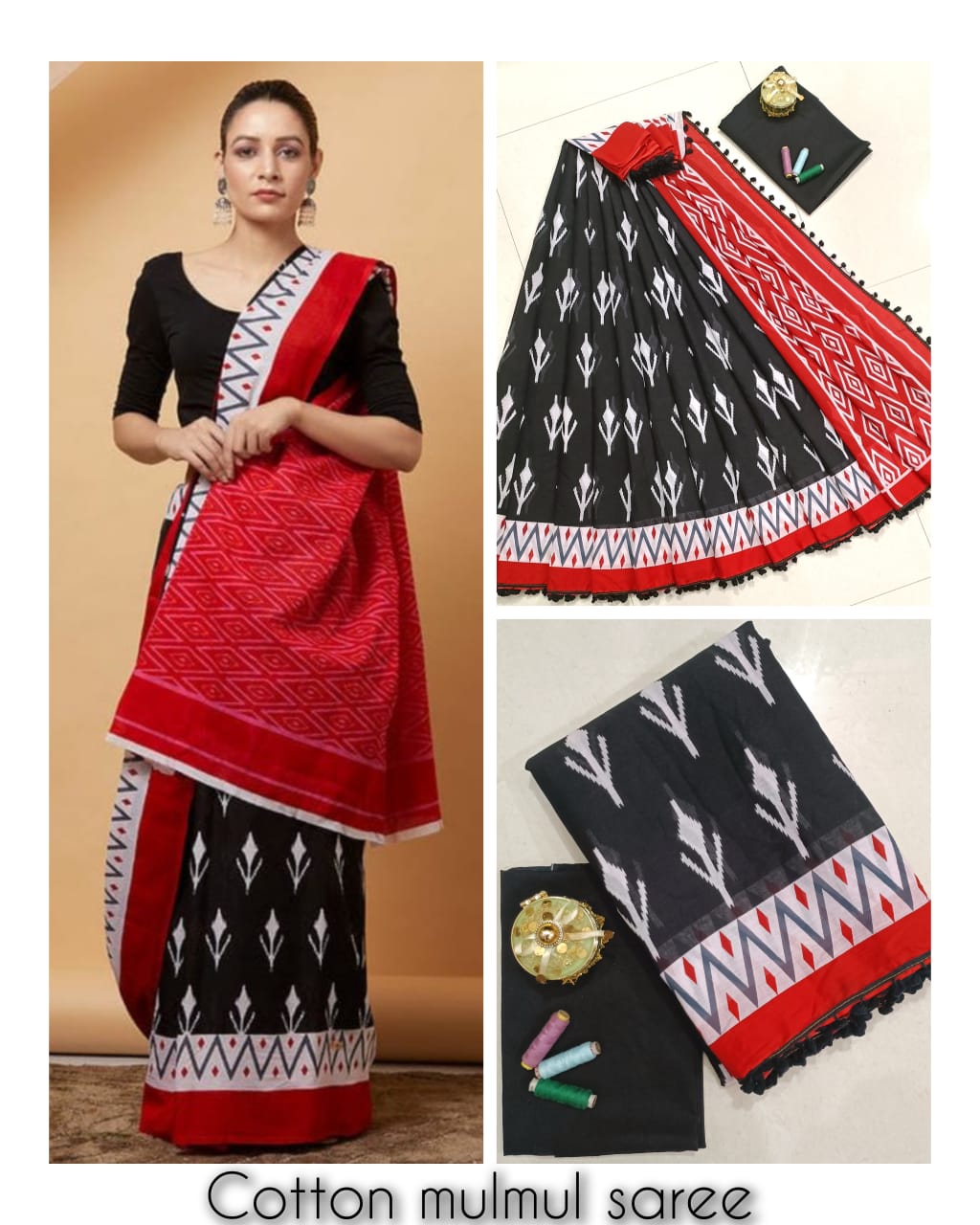 Elevate your wardrobe with our stunning Sanganeri print cotton saree! The rich black and red border adds a touch of elegance to the beautiful screen print. Made with semi-mulmul cotton, this saree is perfect for all-day wear. Complete your look with the matching blouse that comes with it.