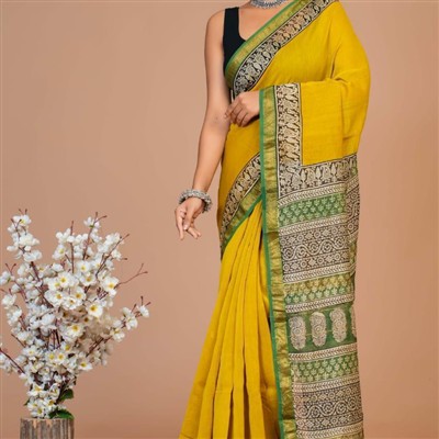 Experience the artisanal charm of this handcrafted mustard cotton saree adorned with intricate black and green borders. The detailed floral and paisley designs on the pallu exude traditional elegance, creating a timeless piece that celebrates Indian craftsmanship.