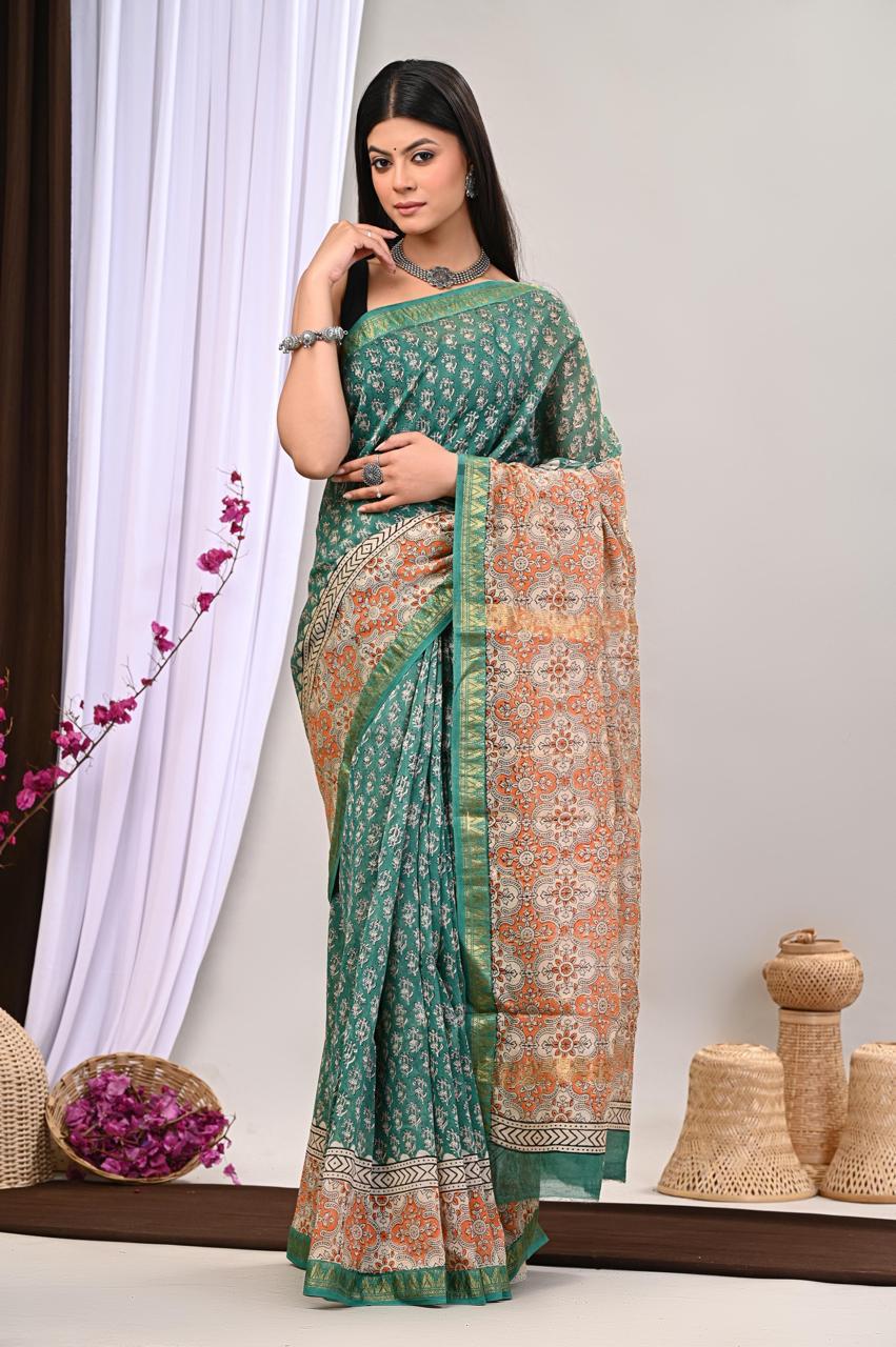 This serene green Maheshwari silk saree is a graceful fusion of subtlety and craftsmanship. It features delicate white hand block prints scattered across the body, exuding a calm and traditional charm. The highlight of the saree lies in its richly designed pallu — an intricate canvas of floral and ornamental motifs in shades of orange, beige, and green, printed using traditional block techniques. Finished with a contrasting golden-green zari border, this saree brings elegance to any occasion. The airy silk-cotton blend makes it perfect for all-day wear, whether at a wedding, pooja, or festive celebration. Paired with antique silver jewelry and a sleek blouse, it offers a timeless ethnic look rooted in artisanal excellence.