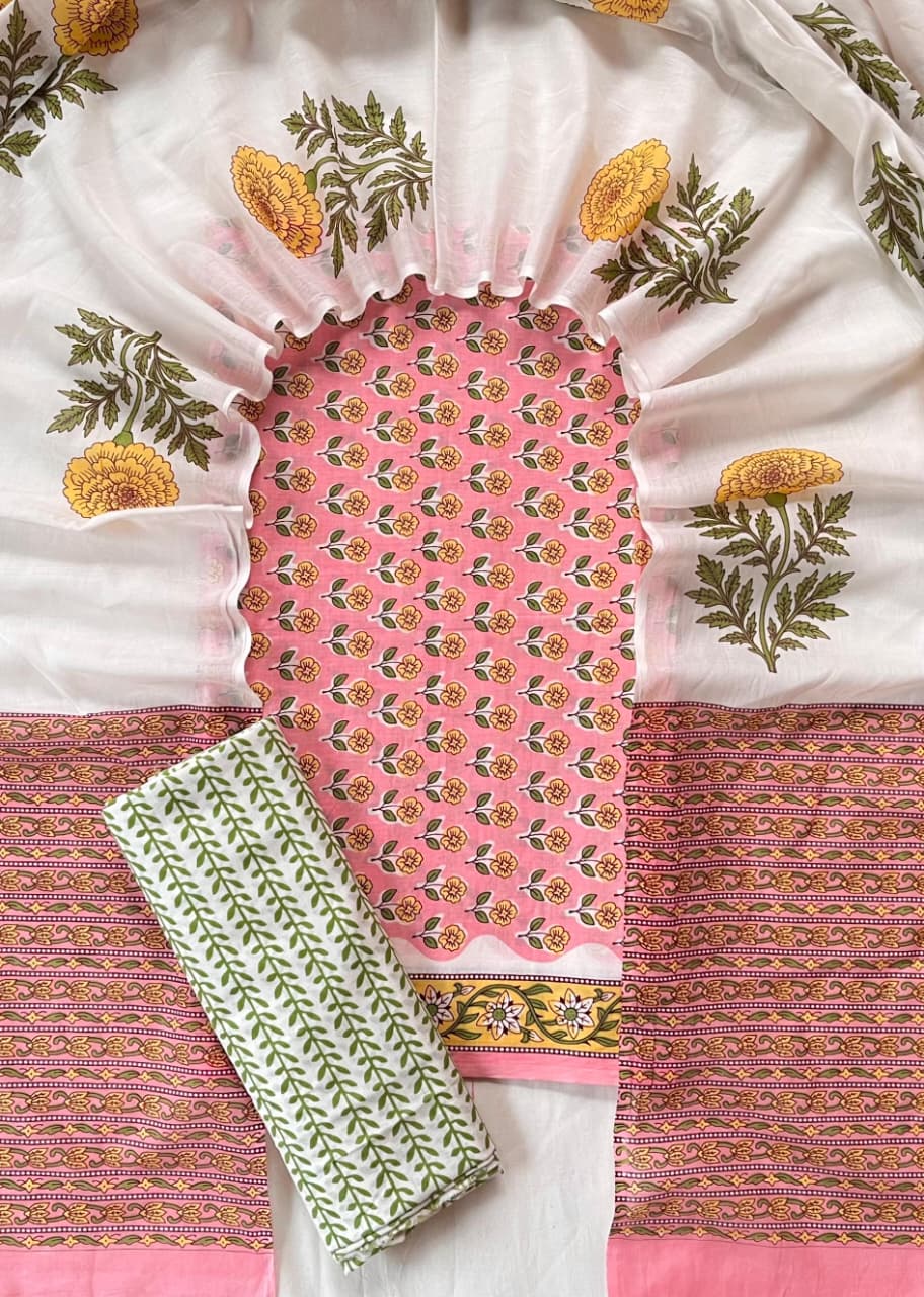 Experience the artistry of hand block printing with this exquisite Green Vine Hand Block Printed Cotton Suit Set from Blockart. Crafted from premium cotton fabric, this set features a white fabric with large yellow floral prints and green leaves, a pink fabric with intricate floral patterns and border details, and an additional piece with a white background and green leafy vine design. The set includes fabric for a top, bottom, and dupatta, all tailored for a traditional outfit. The soft, breathable cotton ensures comfort all day. Embrace the essence of Indian craftsmanship with this elegant ensemble.