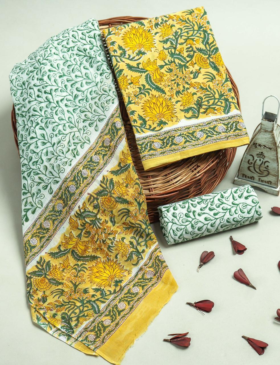 Green & Yellow Floral Block Print Cotton Dress Material Set