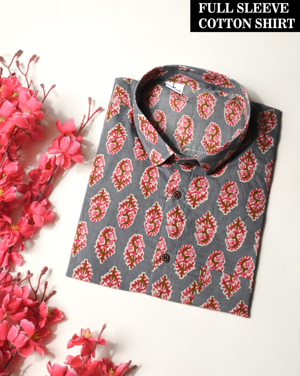 Make a sophisticated statement with this distinctive men's full sleeve cotton shirt. The subtle grey background provides a modern canvas for the intricate pink and brown floral Kalka print, a traditional paisley motif that adds a touch of classic Indian artistry. Each pattern is meticulously hand-blocked, giving the shirt a unique, artisanal feel with subtle variations that highlight its handcrafted nature. Made from 100% pure cotton, the fabric is exceptionally soft, lightweight, and breathable, ensuring superior comfort throughout the day. The full sleeves and classic collar lend a versatile and timeless appeal, making it suitable for a wide range of occasions, from a casual day out to a relaxed evening gathering. Pair it with dark trousers or jeans to create a polished, high-contrast look that lets the beautiful print stand out. This comfortable and fashionable shirt is a perfect choice for those who appreciate unique designs and the rich heritage of Indian textiles.