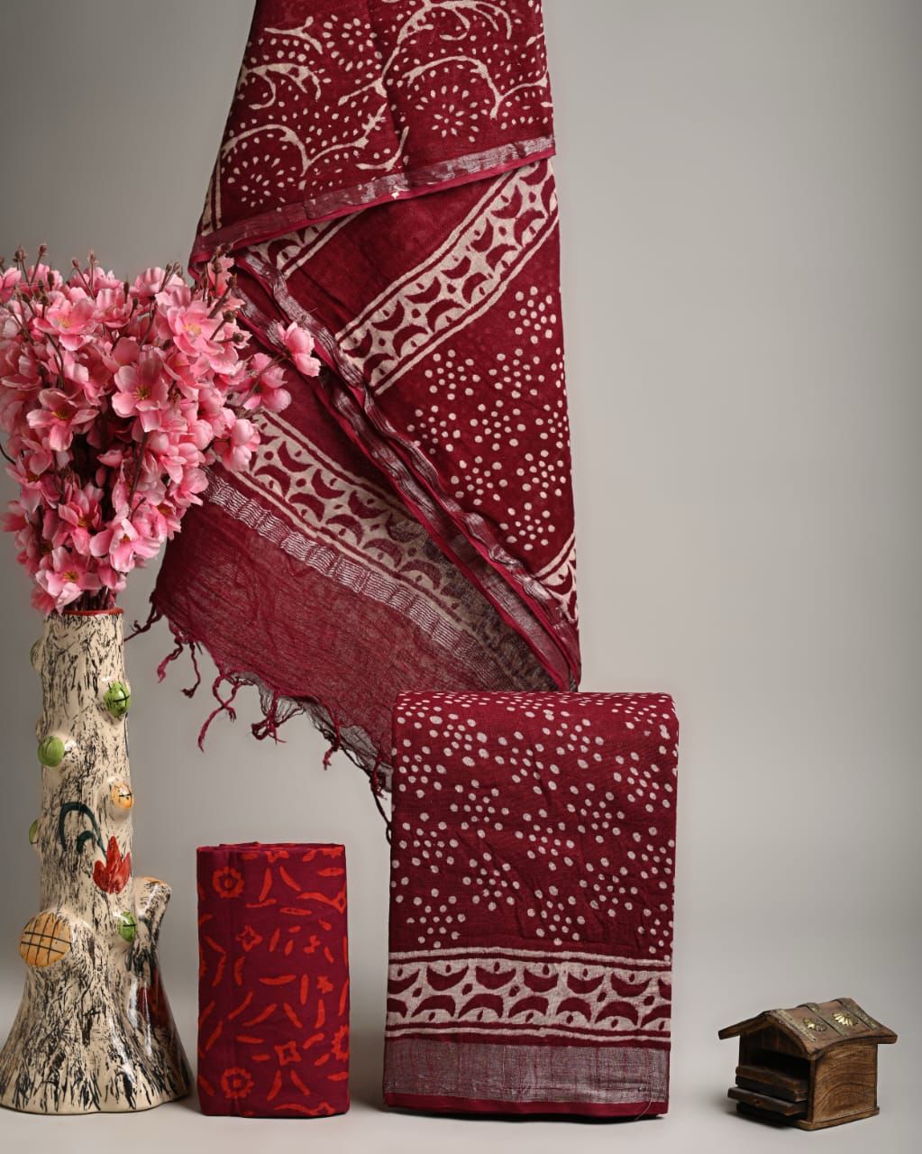 Hand Block Maroon Floral Linen Cotton Dress Set