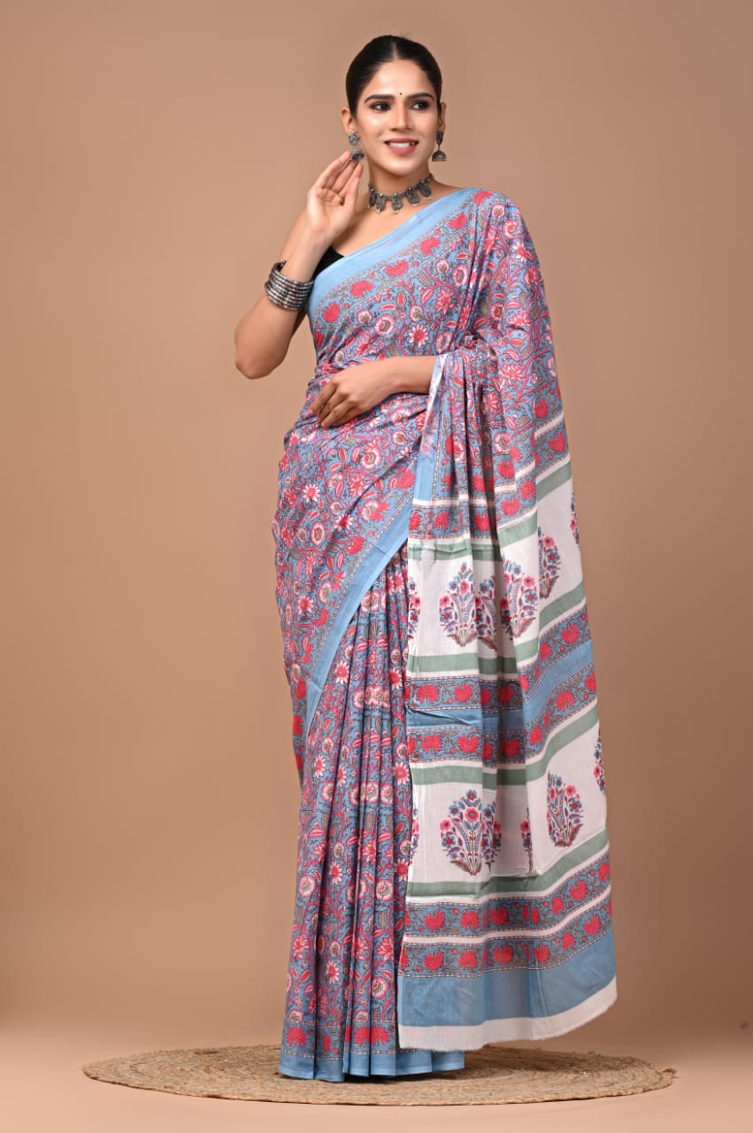 Elevate your ethnic wardrobe with this exquisite hand block printed Mulmul Cotton Saree from Blockart. Crafted with precision, this saree features intricate floral and paisley patterns in vibrant hues of blue, red, and green. The soft cotton fabric ensures comfort all day long, making it perfect for any occasion. The pallu is adorned with horizontal stripes and floral motifs, adding a touch of elegance.