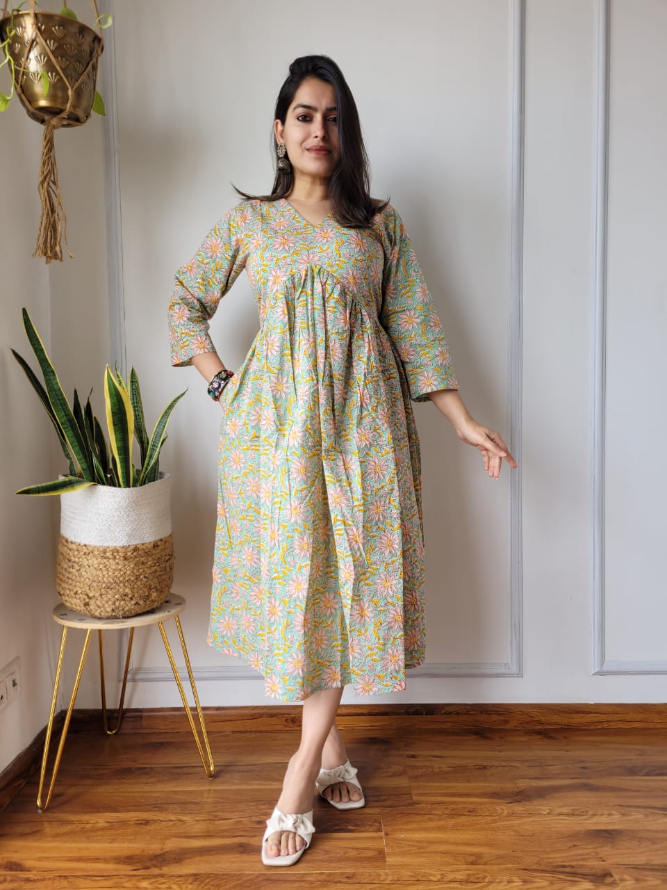 Hand Block Printed Aliya Pattern Cotton Midi Dress