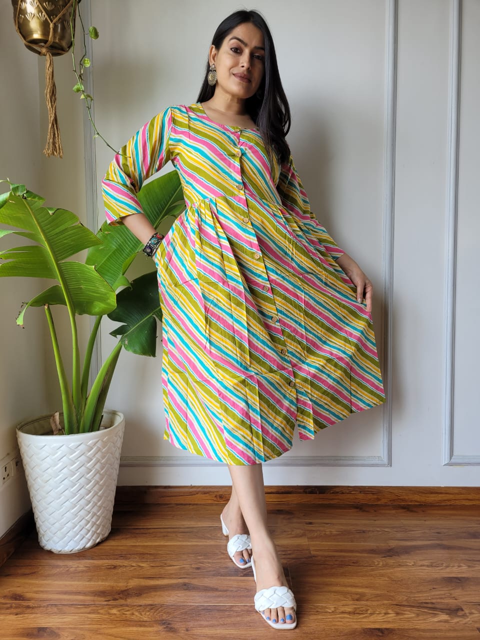 Experience the timeless artistry of hand block printing with our Bagru Cotton Dress. Crafted from premium Cotton 60*60 Super Dying fabric, this dress features a vibrant striped pattern that exudes elegance and charm. The dress boasts a unique frill type design with Aliya pattern, making it a standout piece in your wardrobe. Feel the comfort of breathable cotton fabric combined with the exquisite craftsmanship of traditional Bagru Block Printing. Perfect for casual outings or special occasions, this dress is a true representation of Indian ethnic wear.