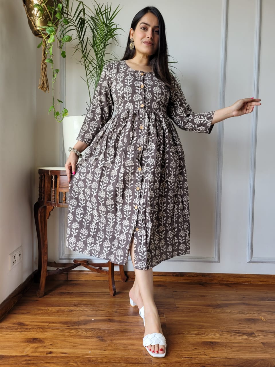 Hand Block Printed Bagru Cotton Midi Dress Frill Aliya Pattern
