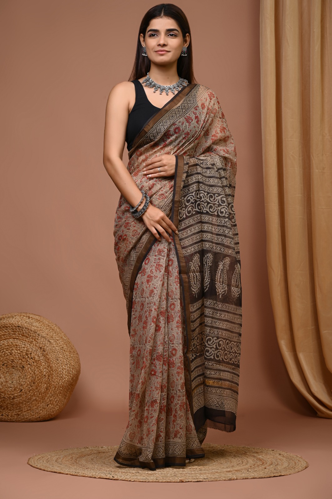 Elevate your ethnic wardrobe with our exquisite Bagru hand block printed Kota Doria Saree. Crafted from lightweight and breathable kota doria fabric, this saree features intricate floral and paisley patterns in earthy tones. The detailed pallu and border add a touch of traditional charm.