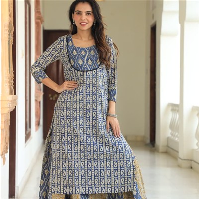 Enhance your ethnic wardrobe with this exquisite handcrafted ensemble from Blockart. This set features a beige and blue cotton kurta with intricate hand block prints, detailed embroidery, and a matching skirt. The comfortable fabric and traditional motifs make it perfect for any occasion.