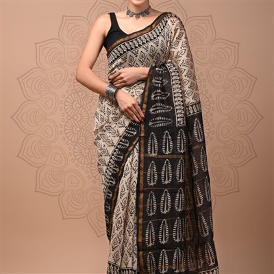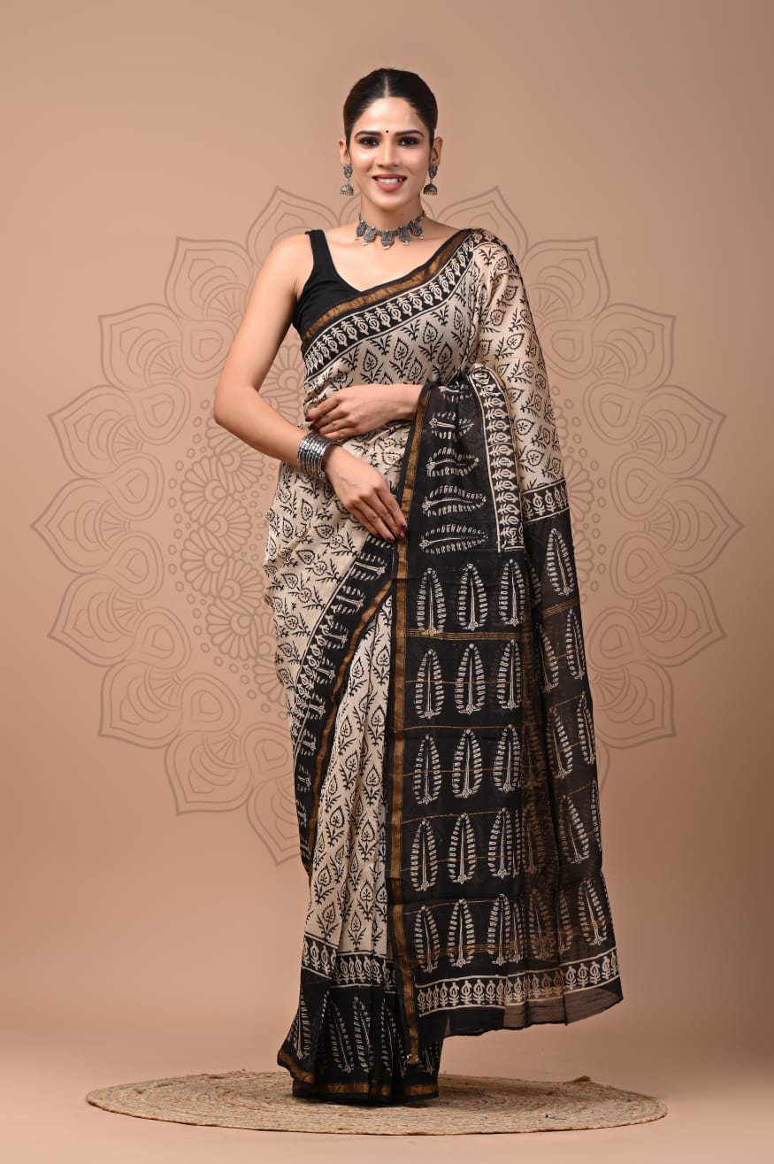 Hand Block Printed Beige Chanderi Silk Saree with Black Leaf Motifs