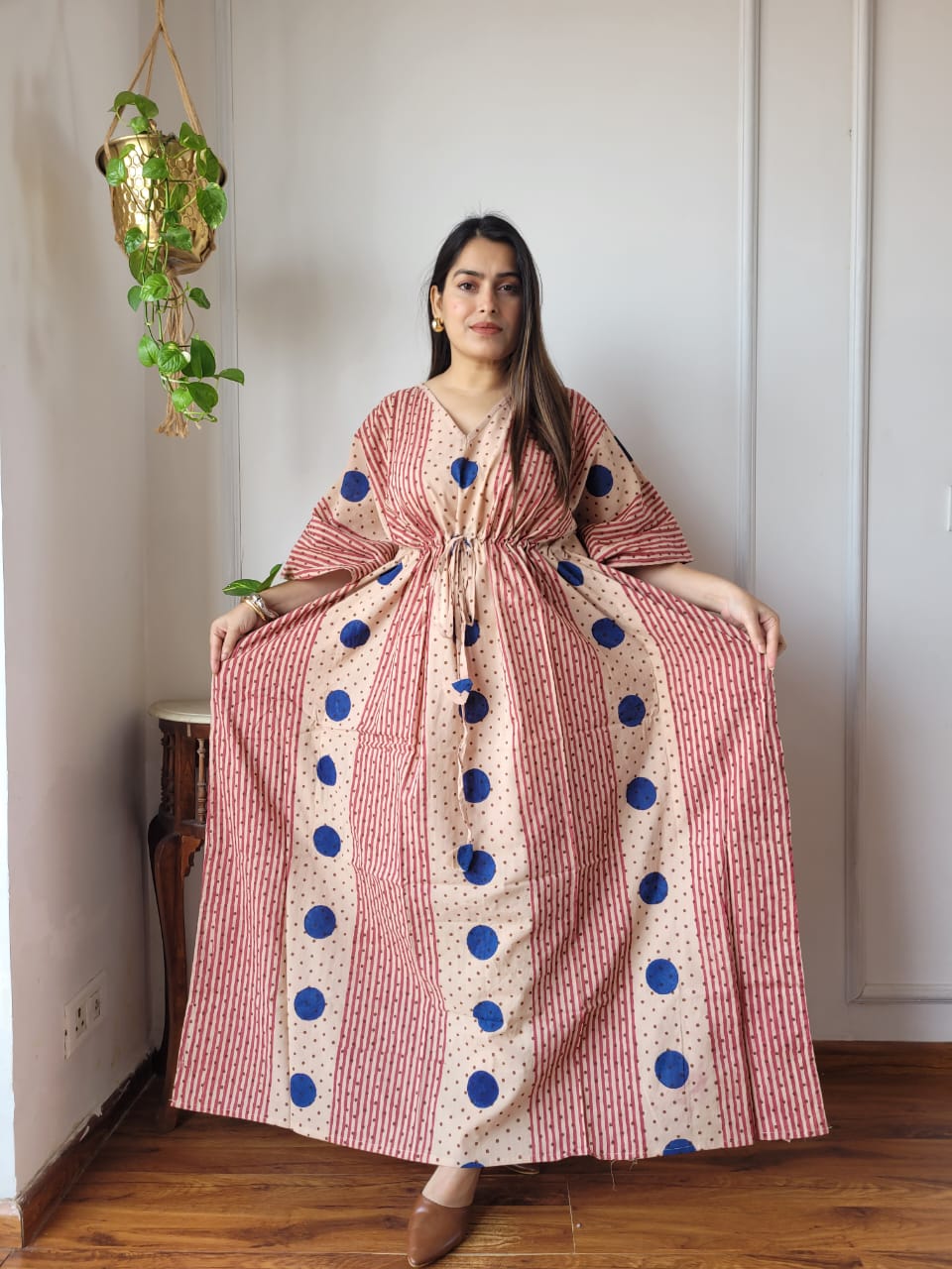 Elevate your style with this exquisite hand block printed cotton maxi dress from Blockart. Crafted with care, this dress features a beige base adorned with captivating red stripes, large blue polka dots, and small black accents. The V-neckline and half sleeves add a touch of elegance, while the drawstring waist ensures a comfortable, adjustable fit. Made of 100% pure cotton, this dress offers a lightweight and soft feel, perfect for casual or semi-casual occasions. Embrace the artisanal charm and traditional craftsmanship of Blockart's ethnic wear.