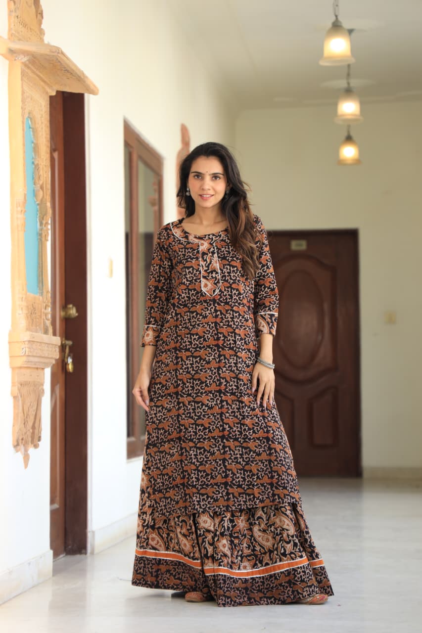 Elevate your ethnic wardrobe with this exquisite ensemble from Blockart. Crafted from premium cotton, this set features intricate hand block printing in traditional floral motifs. The long kurta boasts a charming round neckline with a decorative tie, three-quarter sleeves, and impeccable detailing. Paired with a matching skirt, this ensemble offers comfort and style, perfect for casual or semi-formal occasions.