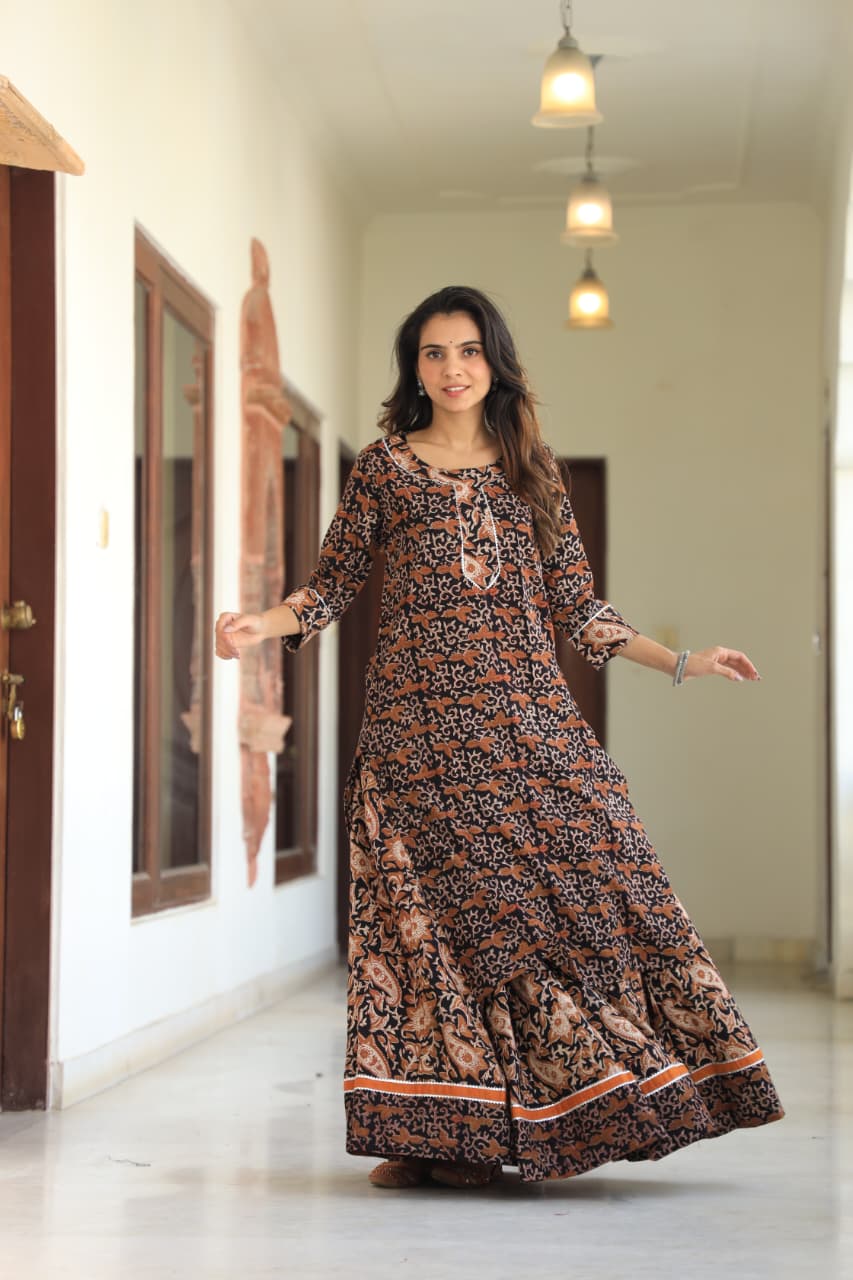 Experience the art of hand block printing with this exquisite long kurti. Crafted from lightweight and breathable cotton fabric, this kurti features a round neckline with a tie-up detail, three-quarter sleeves with contrasting cuffs, and a traditional all-over floral print pattern. The intricate border design at the hem adds a touch of elegance. Embrace comfort and style with this artisanal piece that celebrates Indian craftsmanship.