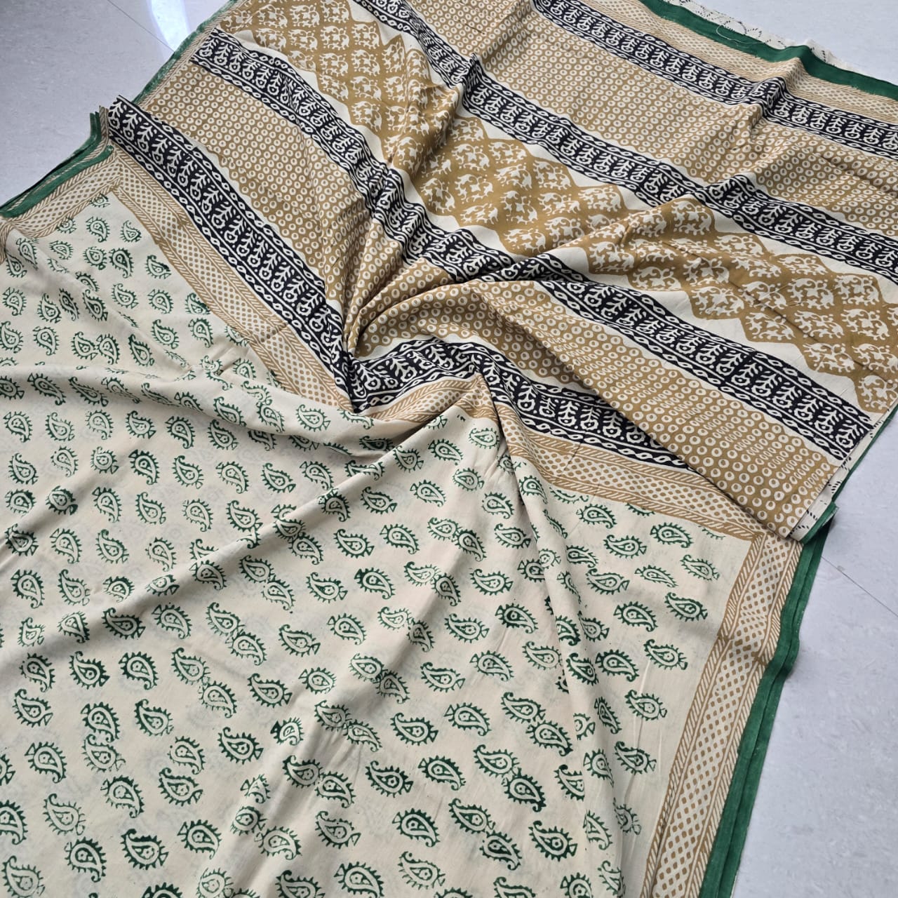 Hand Block Printed Beige Green Saree with Paisley Motifs