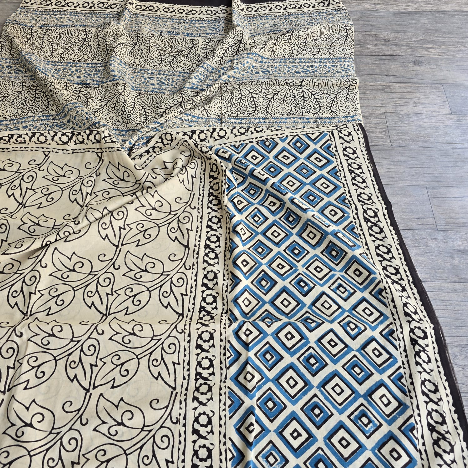 Hand Block Printed Black and Blue Floral Vine Cotton Saree Set