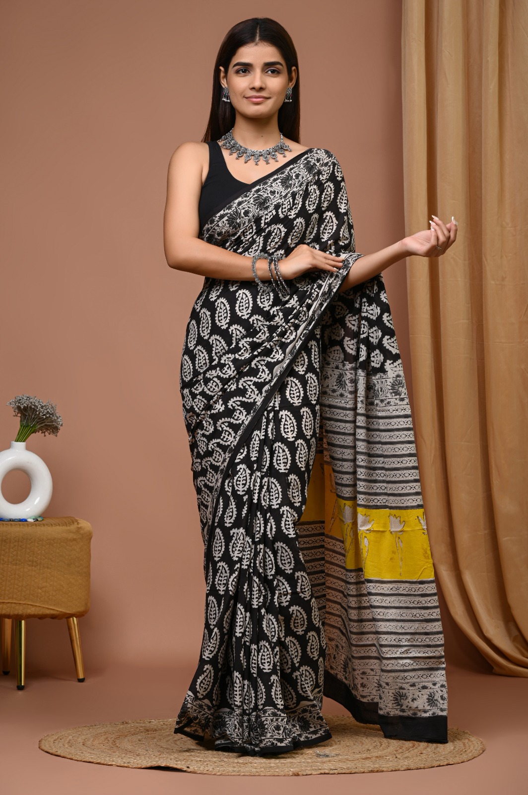 Experience the timeless elegance of hand block printing with our exquisite saree. Crafted from premium mulmul cotton, this saree features a striking black base adorned with intricate white leaf patterns. The pallu showcases traditional designs in black and white, accentuated by a vibrant yellow floral band, adding a pop of color to the ensemble. The lightweight and flowy fabric ensures all-day comfort, making it perfect for special occasions and everyday wear.