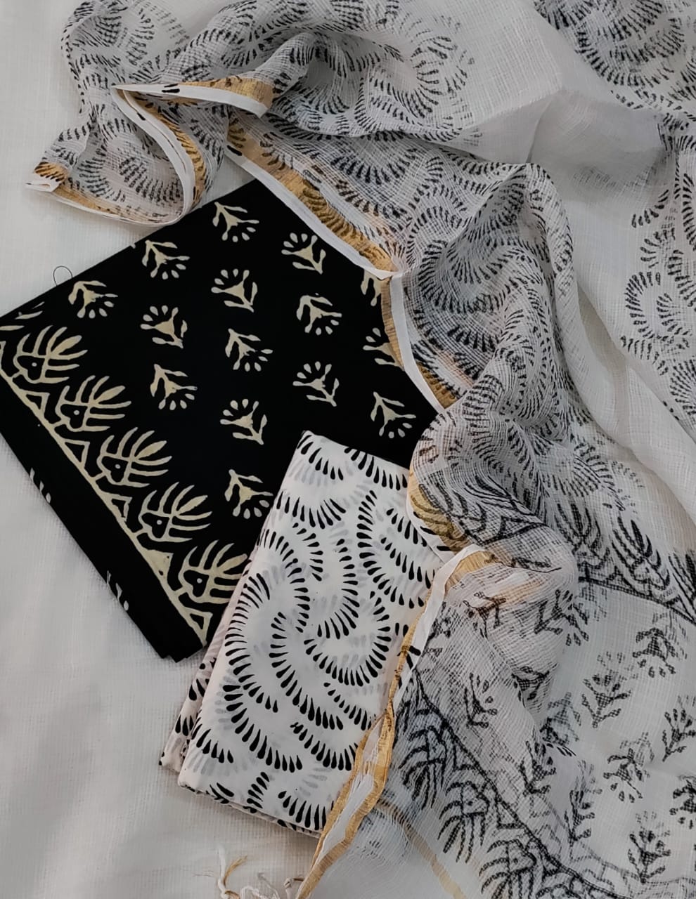 Elevate your ethnic style with this elegant Blockart Hand Block Printed Cotton Unstitched Suit Set, featuring a graceful Kota Doria dupatta. Designed for women who appreciate minimal elegance and handcrafted details, this ensemble blends traditional artistry with modern monochrome aesthetics.