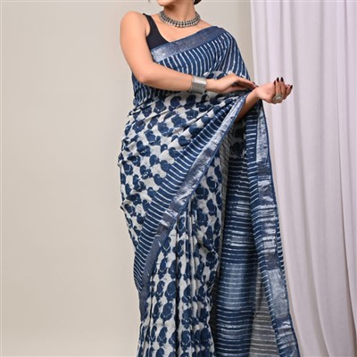 Indulge in the artistry of hand block printing with this exquisite Blue and White Striped Linen Saree from Blockart. Crafted from premium linen fabric, this saree features a mix of floral/abstract and striped patterns, accentuated by a shiny metallic border in blue. The pallu showcases elegant horizontal stripes, adding a touch of sophistication to your ethnic wardrobe. Embrace comfort and style with this lightweight, sheer saree that drapes beautifully, perfect for special occasions or everyday elegance. Elevate your ensemble with traditional silver jewelry for a complete ethnic look.