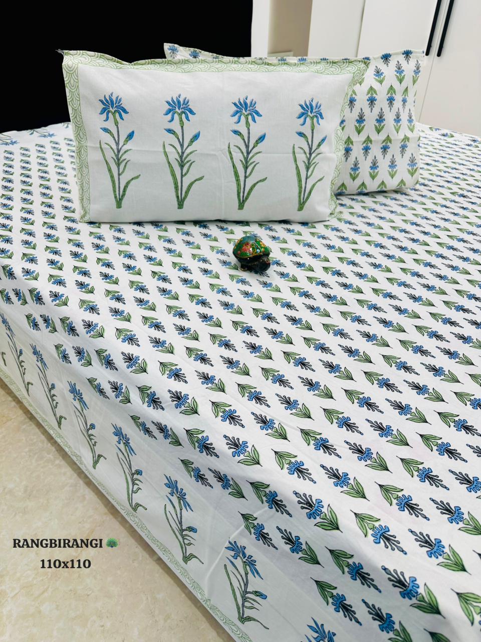 Indulge in the artistry of hand block printing with our exquisite Blue Floral Cotton Bedsheet Set. Crafted from premium cotton fabric, this jumbo king size set includes a beautifully detailed bedsheet measuring 110x110 inches and two pillow covers. The intricate blue floral pattern with green accents adds a touch of traditional charm to your bedroom decor. Experience the comfort and elegance of authentic Indian craftsmanship. Available in limited quantities. Explore more cotton bedsheets.