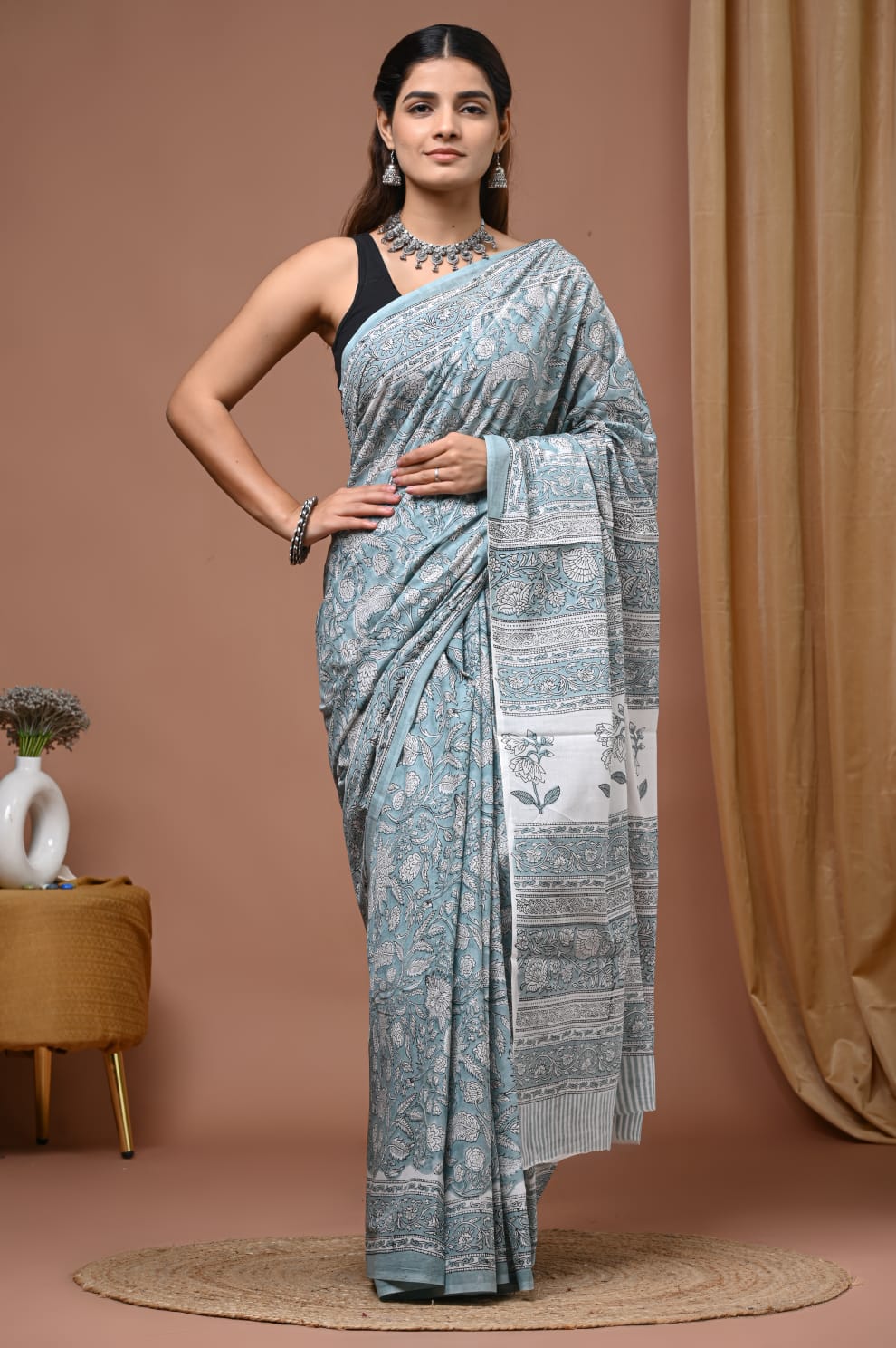 Indulge in the rich tradition of hand block printing with this exquisite saree from Blockart. Crafted from premium mulmul cotton, the saree features intricate floral and paisley patterns in a soothing blue-gray hue. The lightweight fabric drapes elegantly, offering both style and comfort. The matching blouse piece complements the overall look, making it perfect for formal occasions. Embrace the artistry of Indian craftsmanship with this artisanal piece.