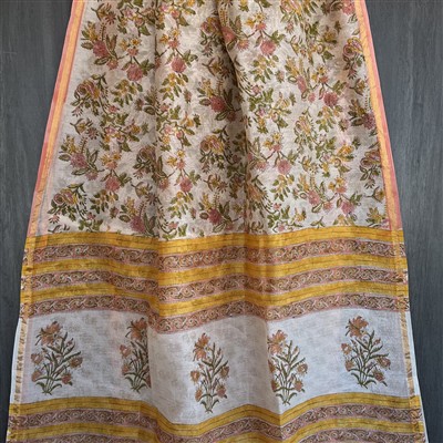 Indulge in the timeless elegance of hand block printing with this exquisite Chanderi silk saree from Blockart. Crafted with precision and care, the lightweight fabric drapes beautifully, offering unmatched comfort. The intricate floral patterns in shades of pink, green, and yellow exude artisanal charm. The mustard yellow and pink borders add a vibrant touch, making it a perfect ethnic wear choice for special occasions. Elevate your style with this premium, handcrafted saree.