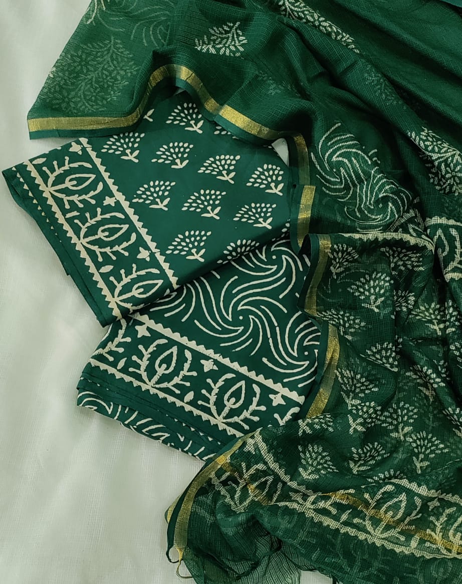 Elevate your ethnic wardrobe with this exquisite hand block printed cotton dress material set from Blockart. Crafted with precision and care, this set includes 2.5 meters of cotton fabric for the top and bottom pieces, along with a beautifully detailed 2.5 meters Kota Doria dupatta.