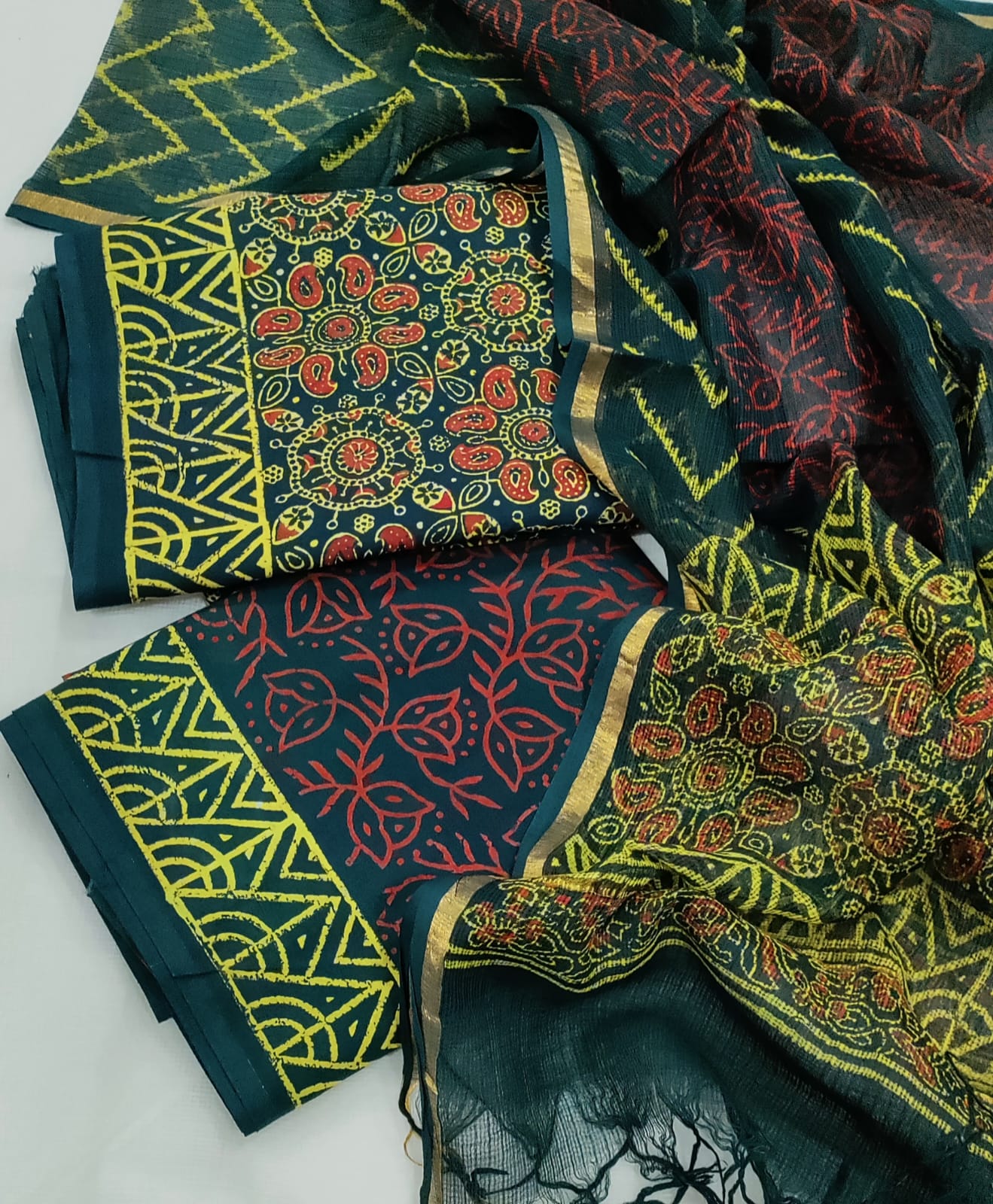Elevate your ethnic wardrobe with this exquisite hand block printed cotton suit set with a Kota Doria dupatta. Crafted with precision and care, the set features intricate floral motifs, geometric borders, and gold accents, showcasing traditional Indian craftsmanship.