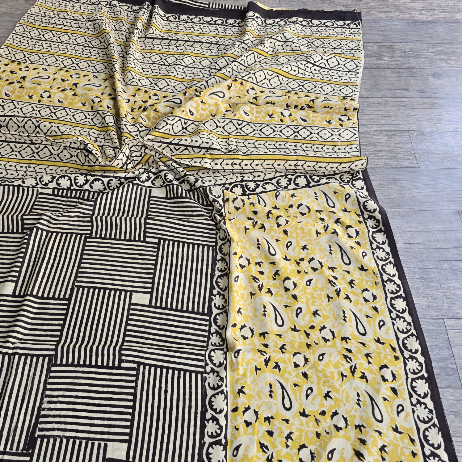 Experience the timeless elegance of hand block printing with this exquisite cotton saree. Crafted from premium mulmul cotton, this saree features a captivating mix of monochrome stripes and intricate yellow floral motifs. The super dyeing ensures lasting vibrancy, while the matching blouse piece complements the overall look. Embrace the artisanal charm of traditional Indian craft with this Blockart creation.