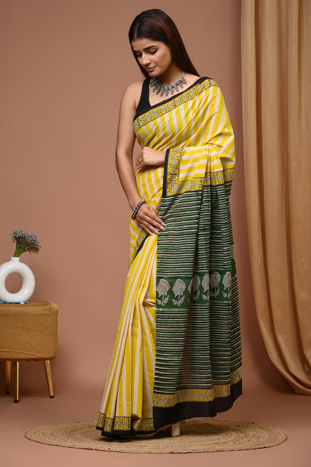 Experience the timeless beauty of hand block printing with our exquisite saree. Crafted from premium mulmul cotton, this saree features a striking striped pattern with intricate floral borders. The highlight is the vibrant green pallu adorned with horizontal stripes and floral motifs, adding a touch of elegance. The 5.5-meter length ensures graceful draping, perfect for casual or semi-formal occasions. Embrace the artistry and comfort of Indian craftsmanship with this artisanal creation.