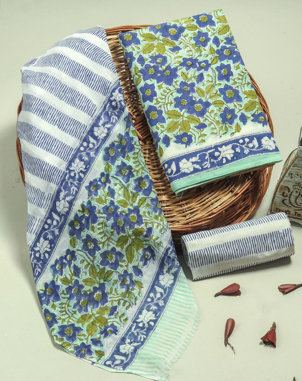 Hand Block Printed Cotton Suit Set in Blue Floral and Striped Patterns