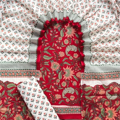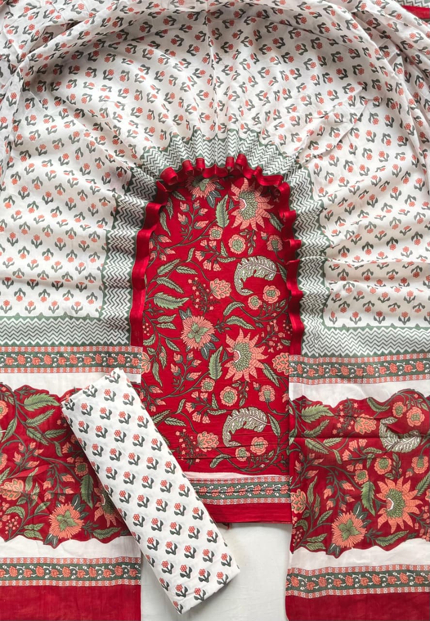 Elevate your ethnic wardrobe with our hand block printed cotton suit set in vibrant red and green florals. Crafted with premium cotton fabric, this set includes a top, bottom, and dupatta, each adorned with intricate floral patterns. The artisanal hand block printing adds a touch of traditional charm, making it a must-have for those who appreciate authentic Indian craftsmanship. Embrace comfort and style with this exquisite ensemble.