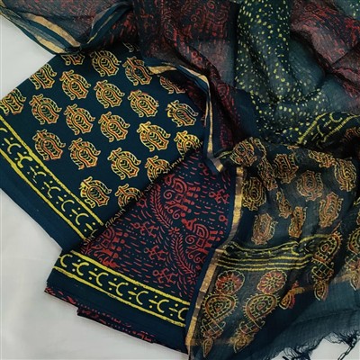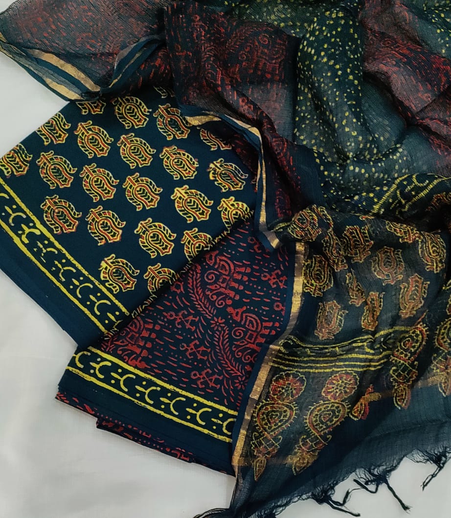 Elevate your ethnic wardrobe with this stunning hand block printed cotton suit set. Crafted with precision, the set includes a top, bottom, and Kota Doria dupatta. The intricate paisley and floral motifs showcase traditional Indian craftsmanship. Made of lightweight and breathable fabrics, this set ensures both style and comfort. Perfect for casual and festive occasions, this set is a true reflection of authentic Indian artistry.